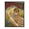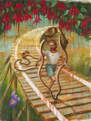 Campbell created vignettes of a mysterious interior world; surreal dreamscapes of layered meaning and reference points, delighting in plunging his viewers down the rabbit hole. Composed of impossible, fractured planes of space, our discombobulation is tempered by frequent recurring symbols and characters, who often resemble the artist himself. A further anchor by which we can attempt to navigate his work are the points of visual humour, like the little disembodied heads of hair in My Parents were Born from the Tracks and indeed the visual play on words conjured between title and subject.