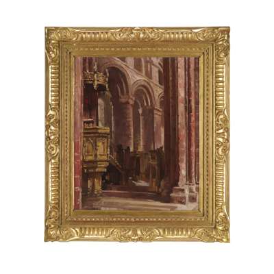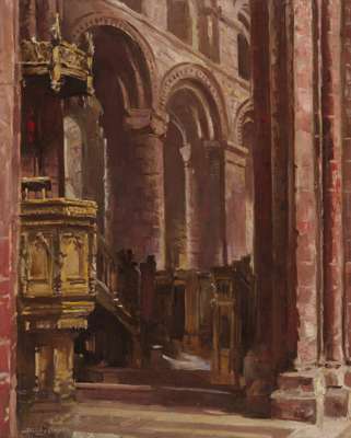 This painting depicts the interior of St. Magnus Cathedral, Kirkwall, Orkney.