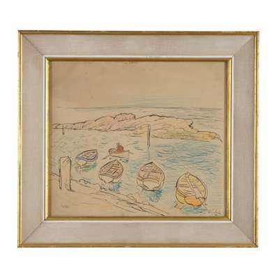 The Scottish Colourist George Leslie Hunter enjoyed a studio practice combined with working en plein air, as revealed in the works presented here. In the early 1920s he discovered the aesthetic delights of the parish of Largo in the Kingdom of Fife, on Scotland’s south-east coast, containing the villages of Lower and Upper Largo. As can be seen in Lower Largo, the beach provided an array of subject matter for his brush. Much is made of the textured foreground of rocks, seaweed and sand. This gives way to the landmark Crusoe Hotel, so named because Alexander Selkirk, on whom the character Robinson Crusoe was based, was born nearby. In the distance a skyline of village buildings curves around the bay, under a sky containing clouds possibly lit by an unseen sunset. Rowing Boats, Largo shows the view from the nearby pier onto the harbour which was an especially favoured motif of the artist.