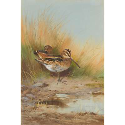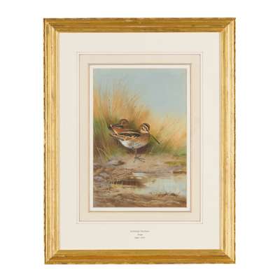 Archibald Thorburn was born in 1869 in Lasswade near Edinburgh. His father Robert Thorburn was a leading miniaturist who worked for Queen Victoria. The young Archibald trained under his father, who emphasised the importance of anatomical study and attention-to-detail. Following his father’s death in 1885, Thorburn travelled to London to study at St John’s Wood School of Art, seeking counsel from the celebrated illustrator of natural history Joseph Wolf. A most important career development came in 1887, when Thorburn was commissioned to paint over 250 watercolours for the ornithologist Lord Lilford’s Coloured Figures of the Birds of the British Isles. Following this, Thorburn enjoyed continued success. He regularly exhibited at the Royal Academy, and Edward VII and George V numbered amongst the collectors of his work. In 1899 he was elected Vice-President of the Royal Society for the Protection of Birds, designing the Society’s Christmas cards until his death in 1935.