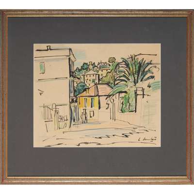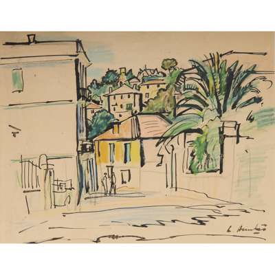 Note: Between 1927 and 1929 Hunter spent extensive periods working in the south of France, particularly in Provence. He captured the climate and life-style in lively works such as the present example. It shows his exceptional skills as a draughtsman, with his deft scene-setting and fluid depiction of trees and architecture. Structure is provided by inked lines, emotion and warmth by the use of coloured chalk, dominated by a verdant green. In 1928, Hunter described Provence as 'the best part of Europe with sunshine every day, fruit, flowers, fine colours and everything the heart could desire.' (letter from Hunter to Matthew Justice quoted in Bill Smith and Jill Marriner, Hunter Revisited: The Life and Art of Leslie Hunter, Edinburgh 2012, p. 136, footnote 13, p. 191).
