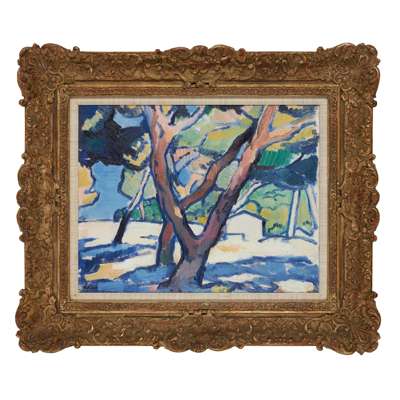Note: Peploe painted Olive Trees, Cassis during a key period spent working beside fellow Scottish Colourist J. D. Fergusson in the titular French port during the summer of 1913. Having moved back to Edinburgh from Paris the year before, the trip allowed Peploe to re-immerse himself in the world of avant-garde French art and Mediterranean sunshine. The brilliance of colour in this painting, its hard-edged form - realised in blunt brushstrokes - and the bold positioning of the foremost tree, reveal an understanding of and experimentation with the work of Fauve and Rhythmist artists who made their names in pre-war Paris.