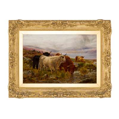 HIGHLAND CATTLE WATERING ON A HILLSIDE