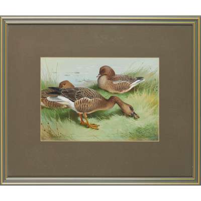 Archibald Thorburn was born in 1869 in Lasswade near Edinburgh. His father Robert Thorburn was a leading miniaturist who worked for Queen Victoria. The young Archibald trained under his father, who emphasised the importance of anatomical study and attention-to-detail. Following his father’s death in 1885, Thorburn travelled to London to study at St John’s Wood School of Art, seeking counsel from the celebrated illustrator of natural history Joseph Wolf. A most important career development came in 1887, when Thorburn was commissioned to paint over 250 watercolours for the ornithologist Lord Lilford’s Coloured Figures of the Birds of the British Isles. Following this, Thorburn enjoyed continued success. He regularly exhibited at the Royal Academy, and Edward VII and George V numbered amongst the collectors of his work. In 1899 he was elected Vice-President of the Royal Society for the Protection of Birds, designing the Society’s Christmas cards until his death in 1935.