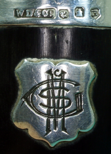by William Dunningham & Company of Aberdeen, marked WD&Co, Edinburgh 1907 - 1908, of conventional form with applied plaque to body with engraved conjoined initials CSMc, the horn lid with applied thistle hinge and vacant oval cartouche