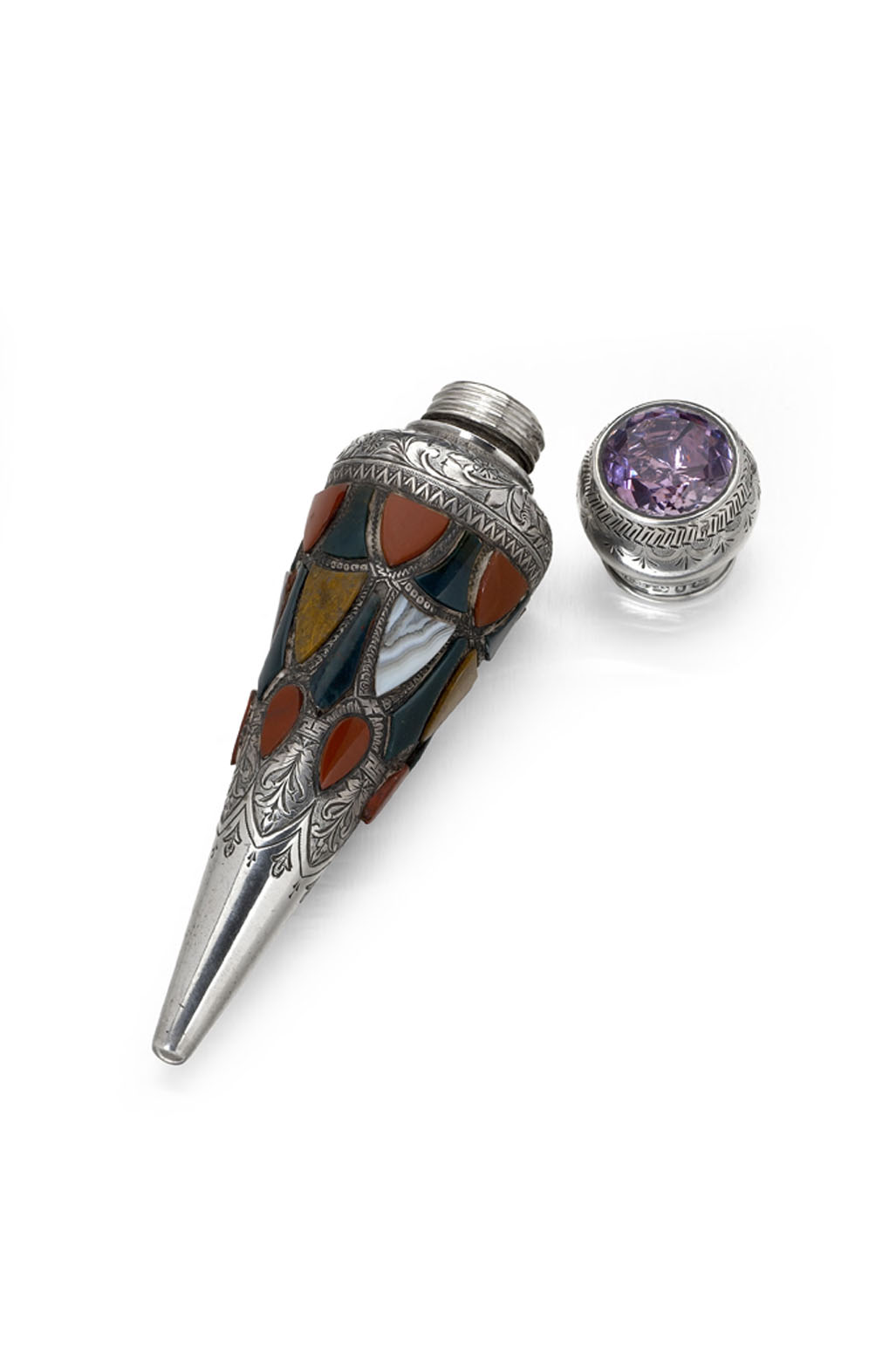by J Cook & Sons, Birmingham 1890, of tapered pointed form with borders of alternate set shield, tear drop and oval agates or hardstones, with foliate engraved borders, the screw off cap set with a circular cut amethyst
