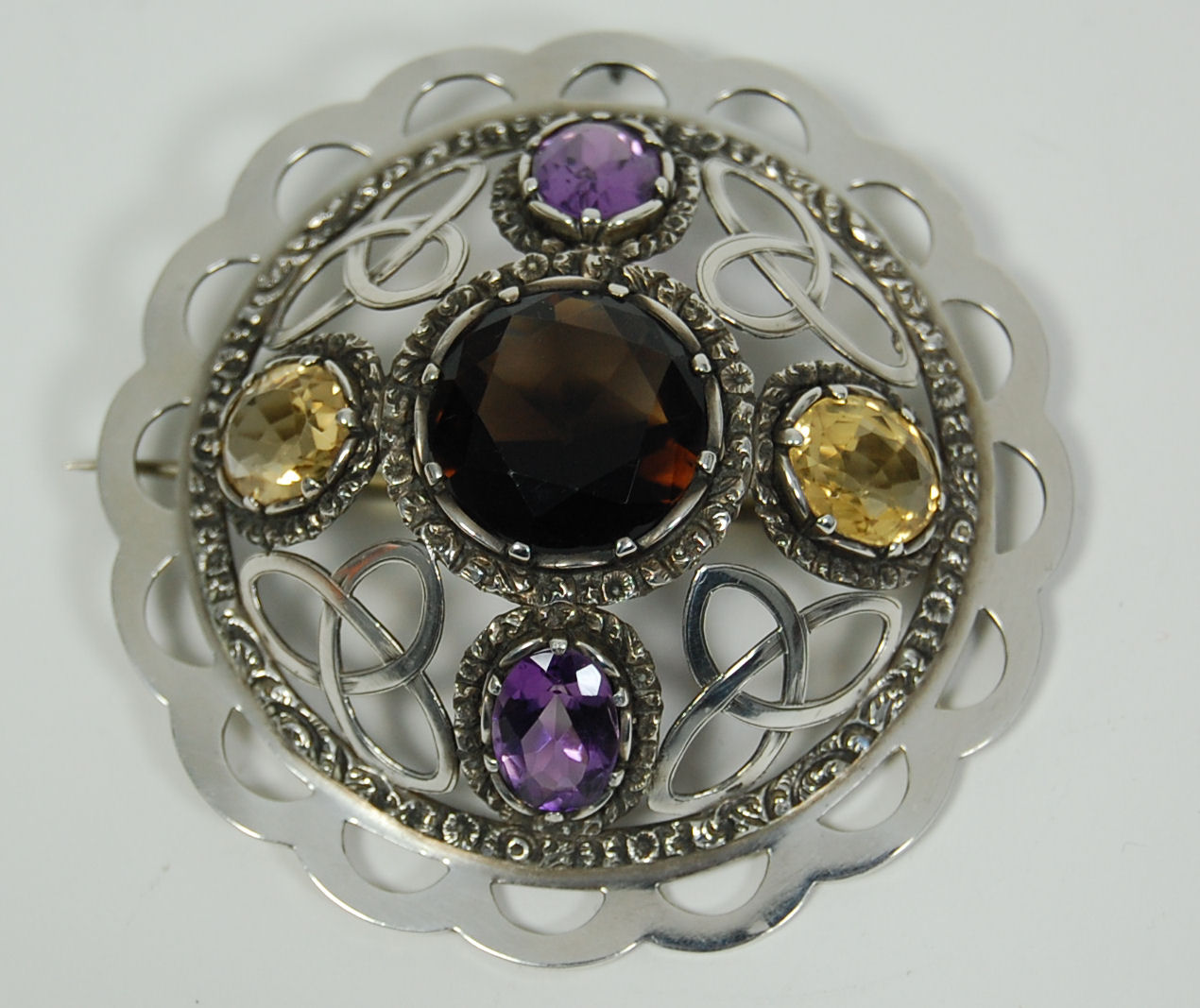 the mounts unmarked, of circular outline with open scalloped border, the domed central section with simple Celtic knot with alternate collet set citrines and amethysts, the centre with claw set 'cairngorm'