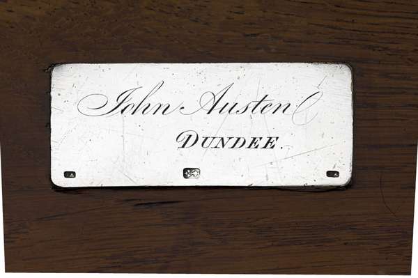 This is an extremely scarce piece where the owner of the item is known not from a crest or arms but from the engraved signature to the applied panel. The signature gives us the tempting answer that this piece was made by John Austen silversmith in Dundee for his own personal use. The makers and town marks indicate he is the maker and the safe assumption that his signature to the panel is a sure indicator he was the owner.