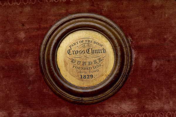 by John Austen of Dundee, circa 1830, marked JA, pot of lilies, JA, the rectangular oak casket of simple rectangular form with applied rectangular plaque to the lid with script engraved signature 'John Austen Dundee', the interior of the box lined with red velvet and applied central disk reading 'part of the roof of the Cross Church DUNDEE founded 1139 taken down 1829'