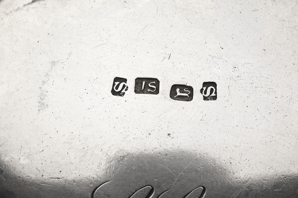 by John Scott of Perth, circa 1825, marked S, JS, cat, S, the oval bowl with everted rim, engraved with script initials CG, the turned wooden handle with knopped stem and reeded grip, with simple ball finial