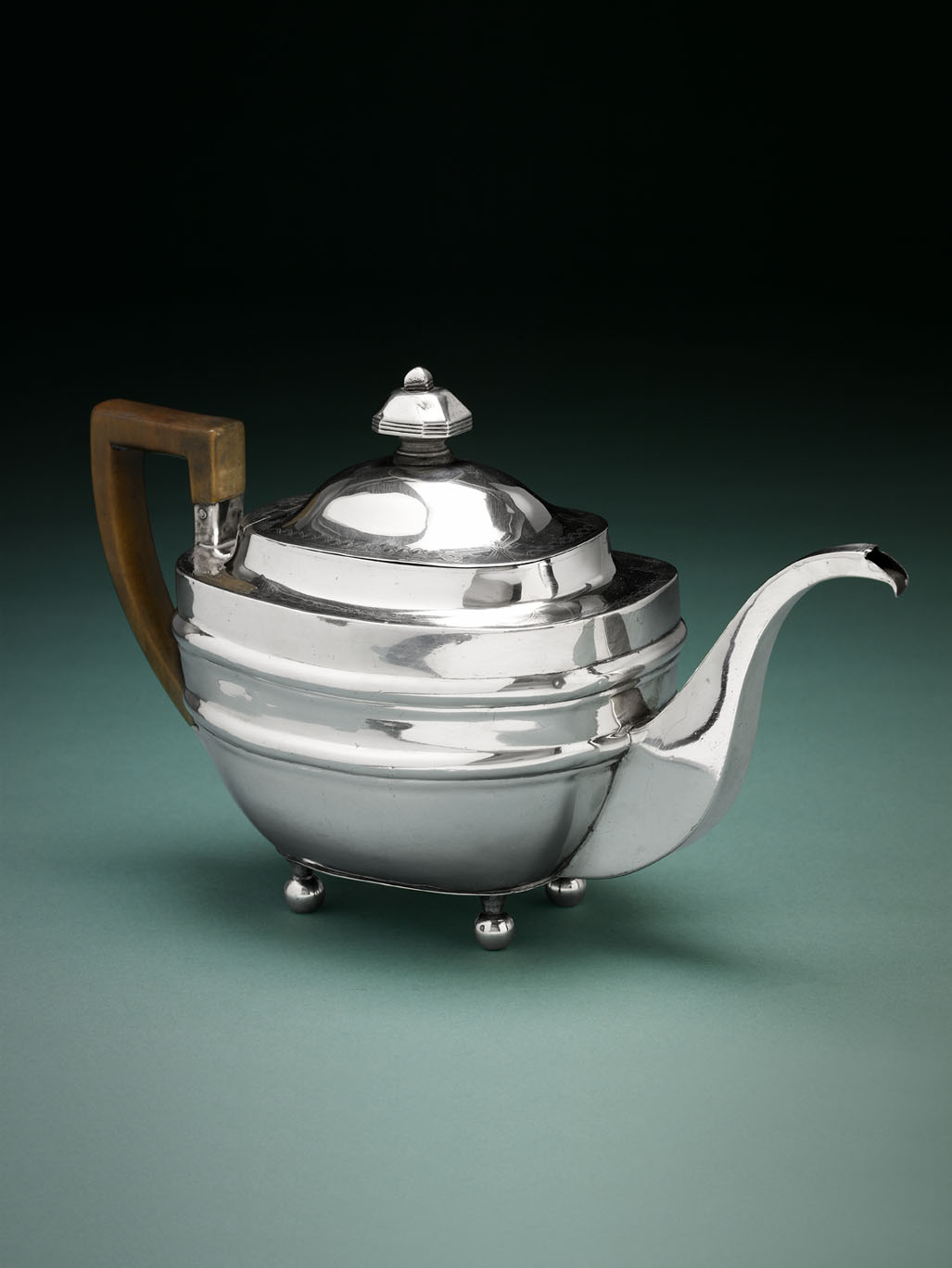 by Joseph Pearson of Dumfries circa 1800, marked fouled anchor, IP, E, stag's head, of tapered rectangular form with banded decoration to the body, the domed hinged lid with prick dot engraved intertwined borders and hatched details to the corners, with a hexagonal finial, bold square section spout and square section angular fruit wood handle, all raised on four ball feet