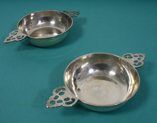 by Celtic Art Industries of Iona, circa 1950, marked to lugs DB, CA, IONA, the simple circular bowls with two shaped and pierced lugs