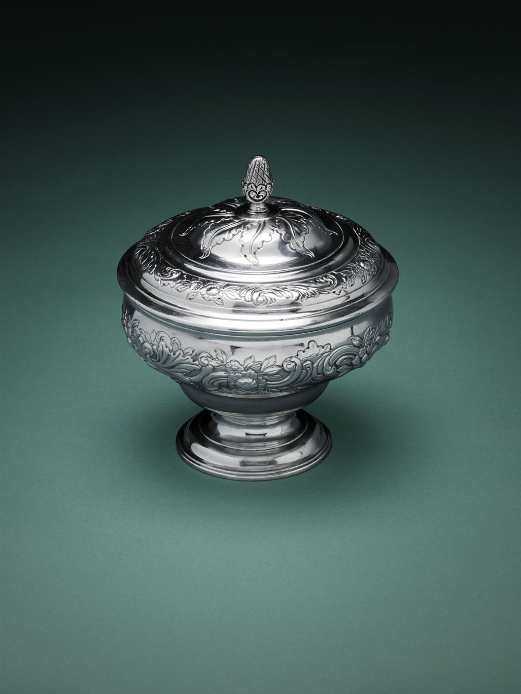 by Milne & Campbell of Glasgow circa 1765, marked M&C (struck twice), Glasgow town mark, O, of inverted pear shaped bowl chased with shell, scroll and flower head designs, the domed pull off cover with acanthus and flower border and spiraled leaf panel, with bud finial