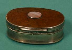 marked AM, indistinct p?, O, possibly AM of Perth, of oval outline with hardstone base and lid, the lid additionally applied with lace agate central oval cabochon, the body of simple reeded borders