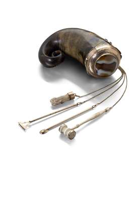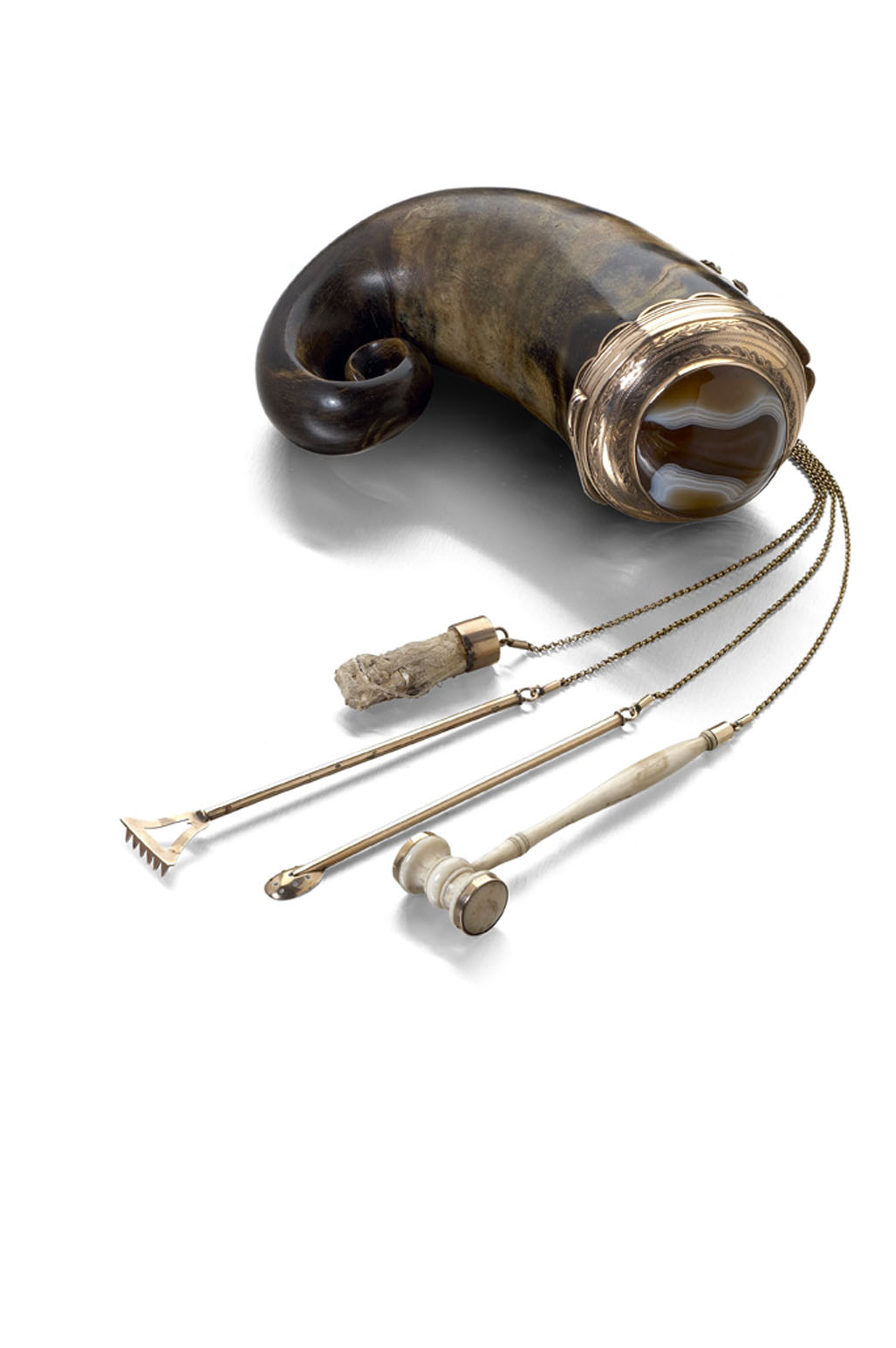 the mounts unmarked, the well curled horn the mount with ribboned border and with domed hinged cover, the cover engraved with prick dot and foliate borders, set to the centre with a cabochon banded agate, the body applied with a thistle mount with tools (paw, snuff spoon, rake and ivory mallet) suspended from a fine belcher link chain