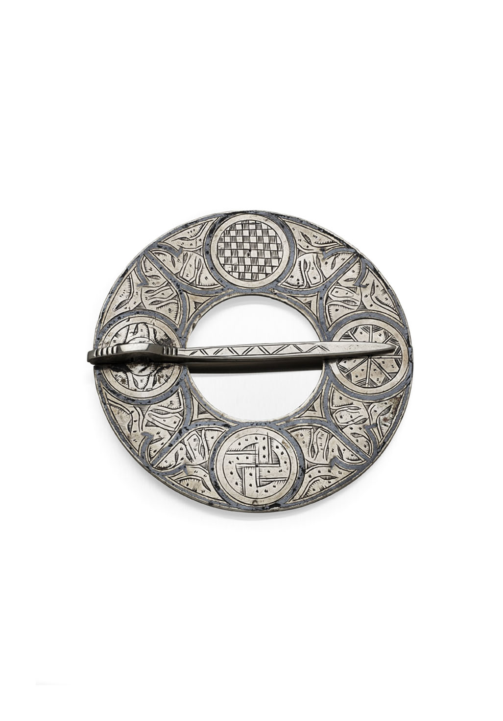 unmarked, the annular brooch with four engraved bosses with knot work, cross hatched and star designs, the panels of decoration between, with simple intertwined engraved designs, with niello highlights and borders, the integral hinged pin with zig zag detail, engraved to reverse with contemporary script 'MS 1781' and later presentation inscription 'Presented to Stewart Menzies by his affectionate MOTHER Perth 8th August 1860'', in script