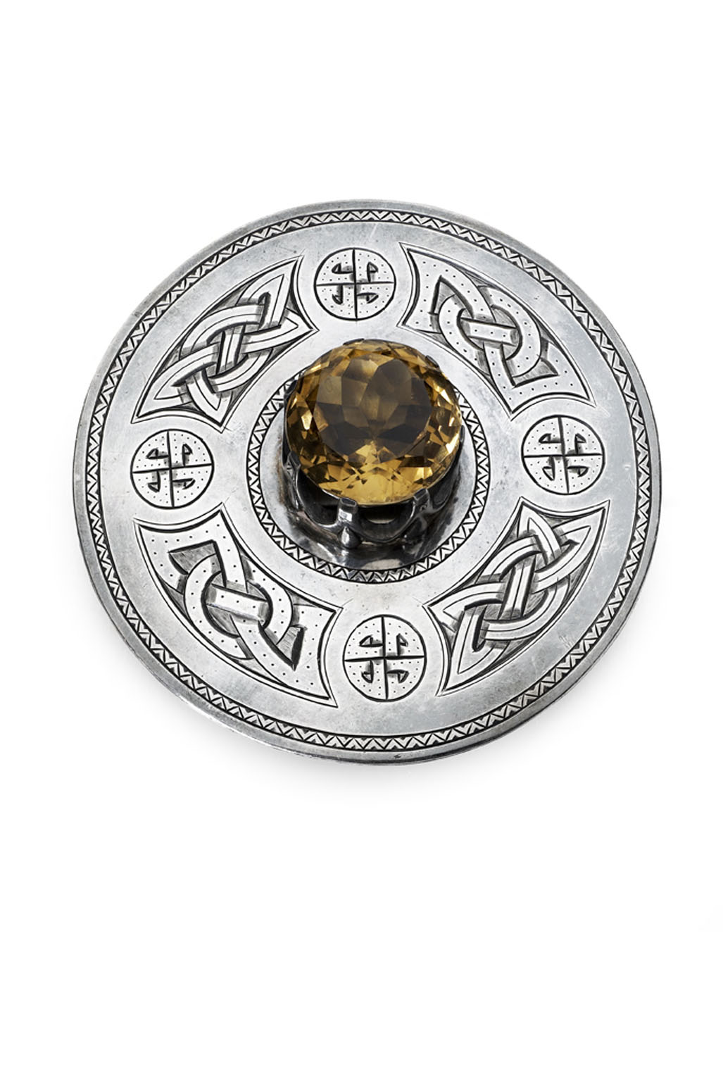 by Thomas K Ebutt, Edinburgh 1926-1927, of annular design with engraved Celtic bosses and knotwork panels around a raised claw set circular cut citrine