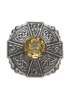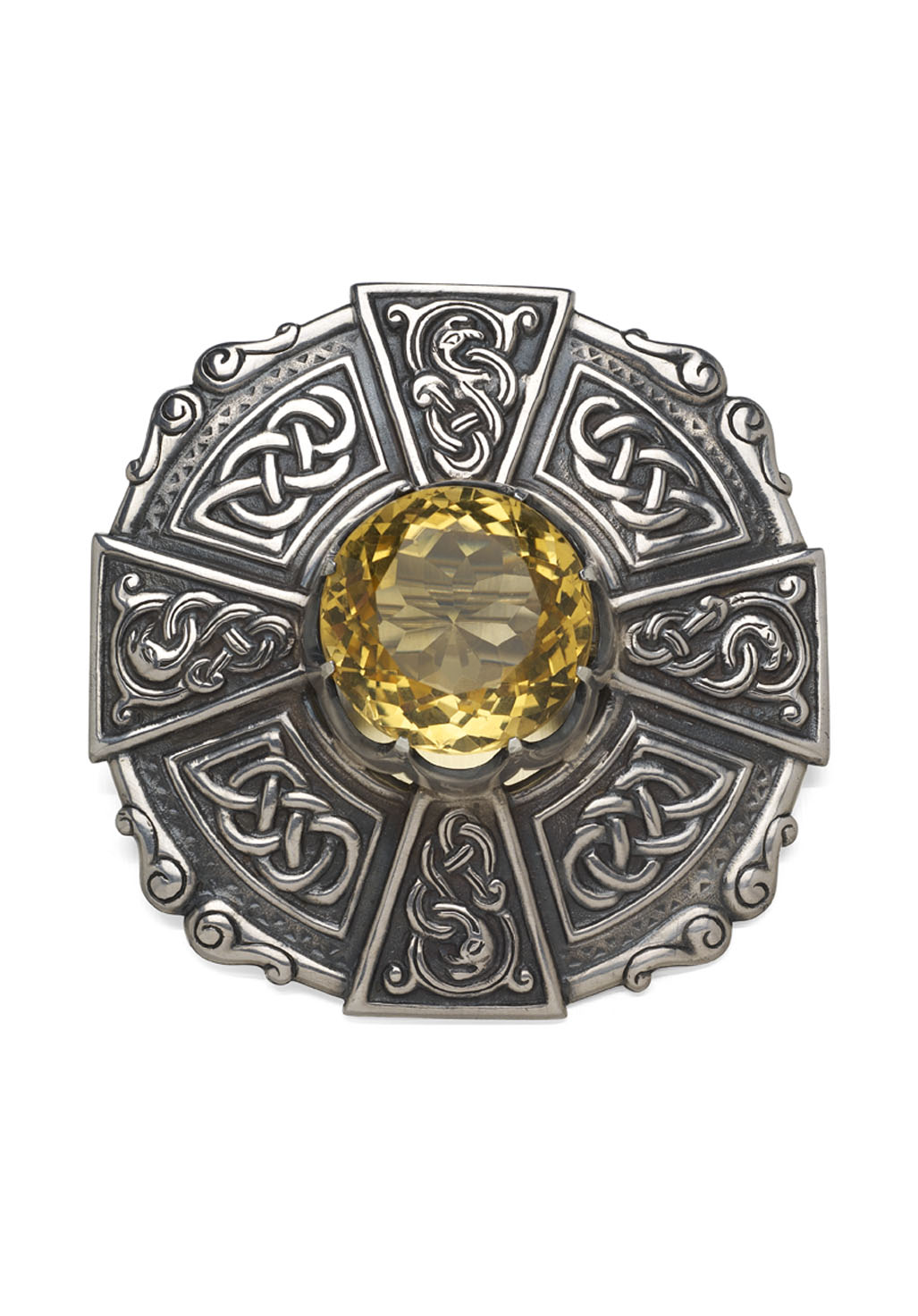 by R W Forsyth, Edinburgh 1925-1926, of shaped circular outline with alternate panels of Celtic knotwork and intertwined Celtic beasts, claw set to the centre with a circular cut citrine