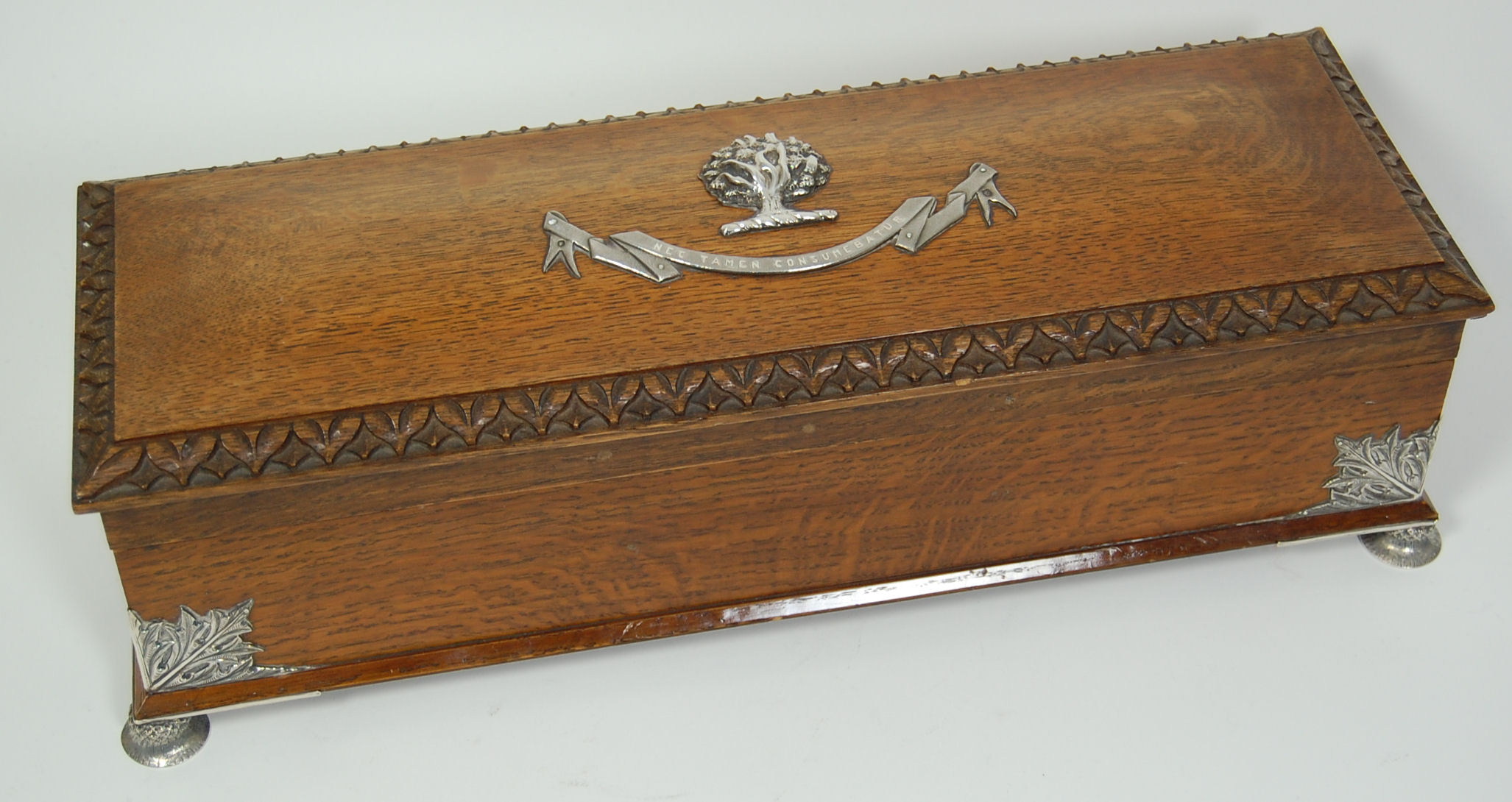 the mounts by Hamilton & Inches, Edinburgh 1887 - 88, the rectangular oak casket with applied thistle leaf brackets to corners and raised on four inverted thistle head feet, the lid applied with the crest of a burning bush with the motto 'NEC TAMEN CONSUMEBATUR' in scroll below