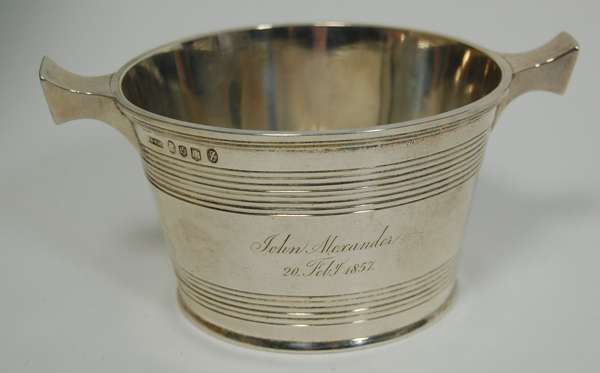 by John & William Marshall (of Glasgow), Edinburgh 1856-1857, of tapered circular form with two bands of reeded borders, with two integral up swept lugs, the body engraved in script 'John Alexander / 20th Febr 1857'