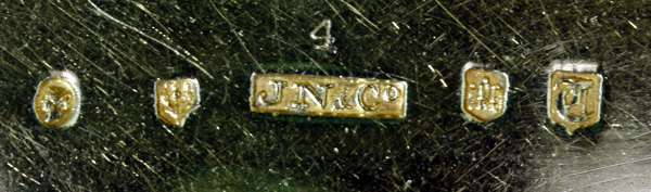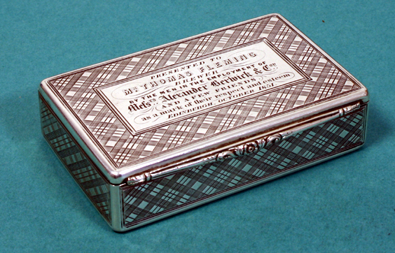 by James Nasmyth & Co, Edinburgh 1851-1852, of rectangular outline, the body and lid with tartan effect engraved decoration the central cartouche to lid engraved with presentation inscription, with applied reeded and foliate thumb piece to lid