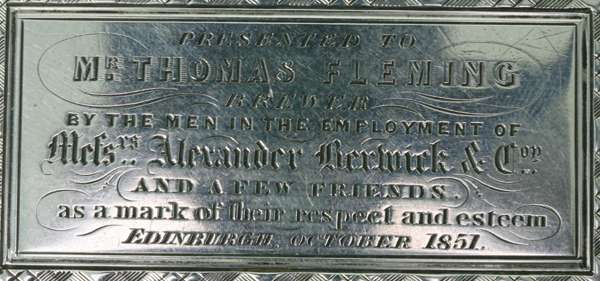"Presented to Mr Thomas Fleming, Brewer by the men in the employment of Messrs Alexander Berwick & Co and a few friends as a mark of their respect and esteem, Edinburgh October 1851"