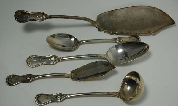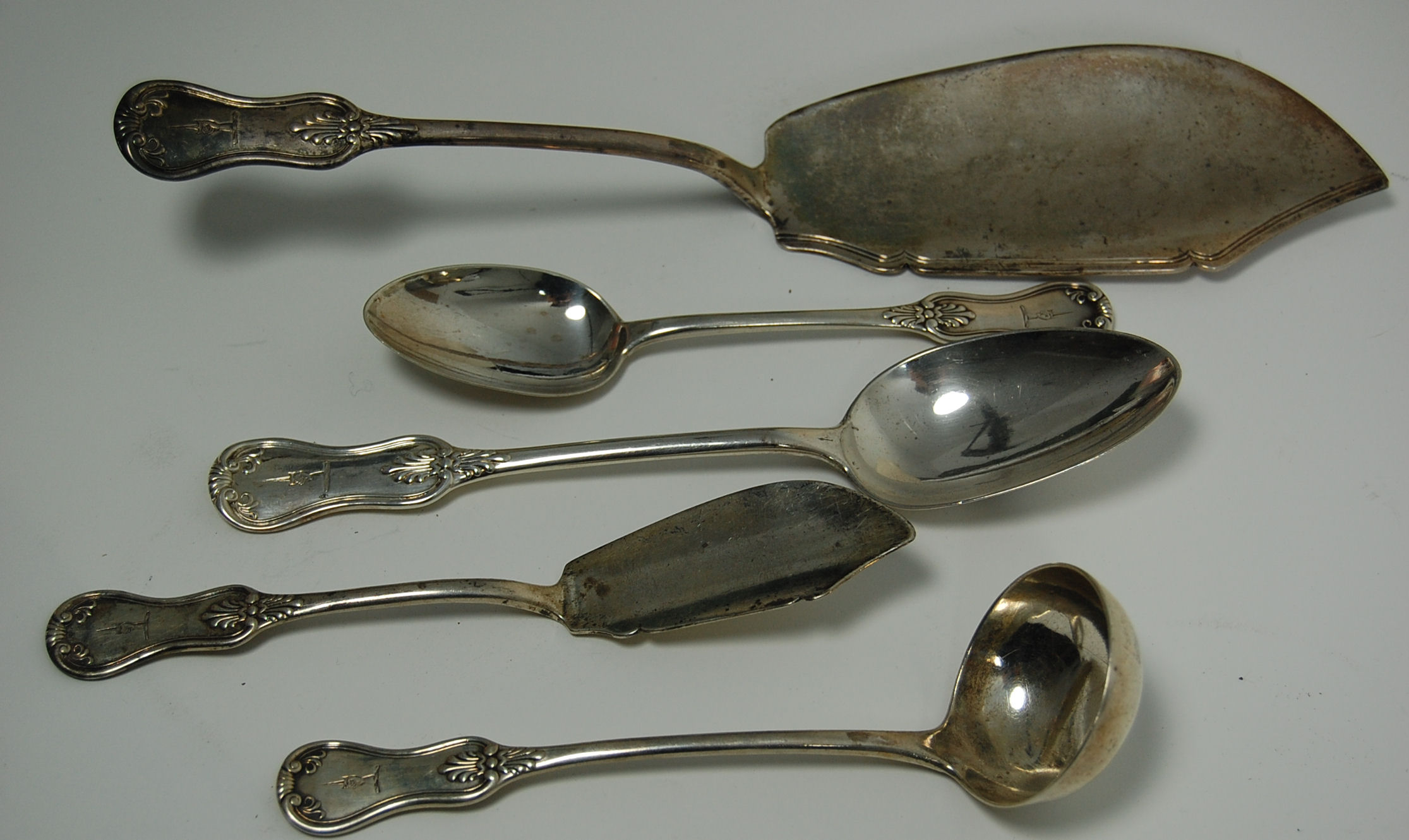 all with matching engraved crest; together with a set of twelve fish knives and forks by HH, Sheffield 1866, with ivory handles with stained crest, the blades and forks of shaped outline with wriggle work border, all contained within a fitted mahogany three drawer canteen, with original Robert Gray & Sons label (qty)
