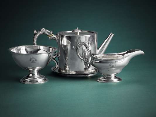 teapot 12cm high, 22.5oz; stand 15cm diameter, 6.5oz; slop bowl 8.5cm high, 6oz; cream boat 20cm wide, 5.5oz
