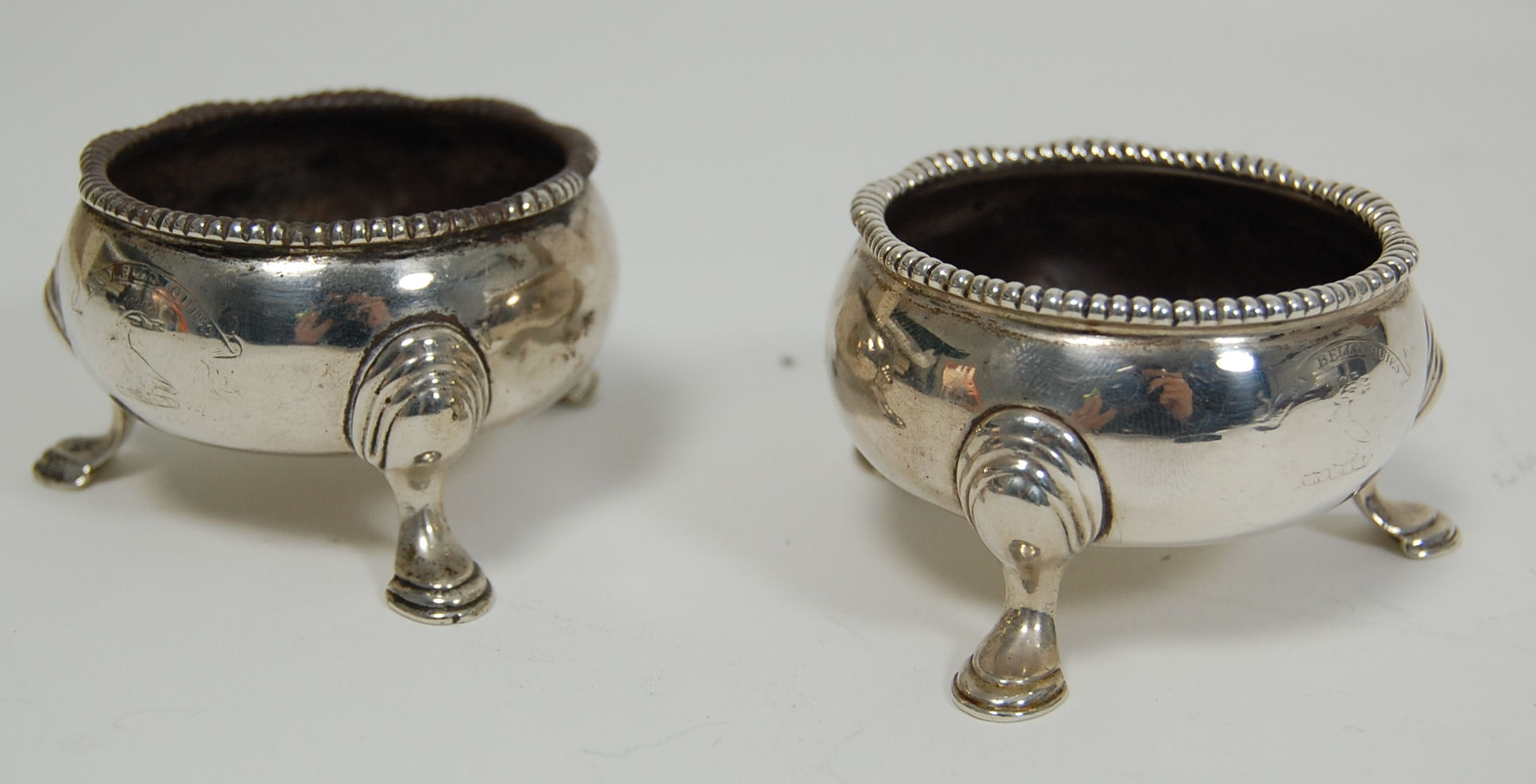 by Ebenezer Oliphant, Edinburgh 1742-1743, Assay Master Edward Lothian, with beaded and slightly scalloped rim, raised on three stepped hoof feet (2)