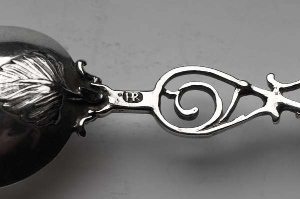 A small number of Scottish Fiddle pattern teaspoons are also known from a similar period to this example with the same HR conjoined maker's mark struck to the stem.