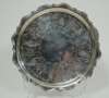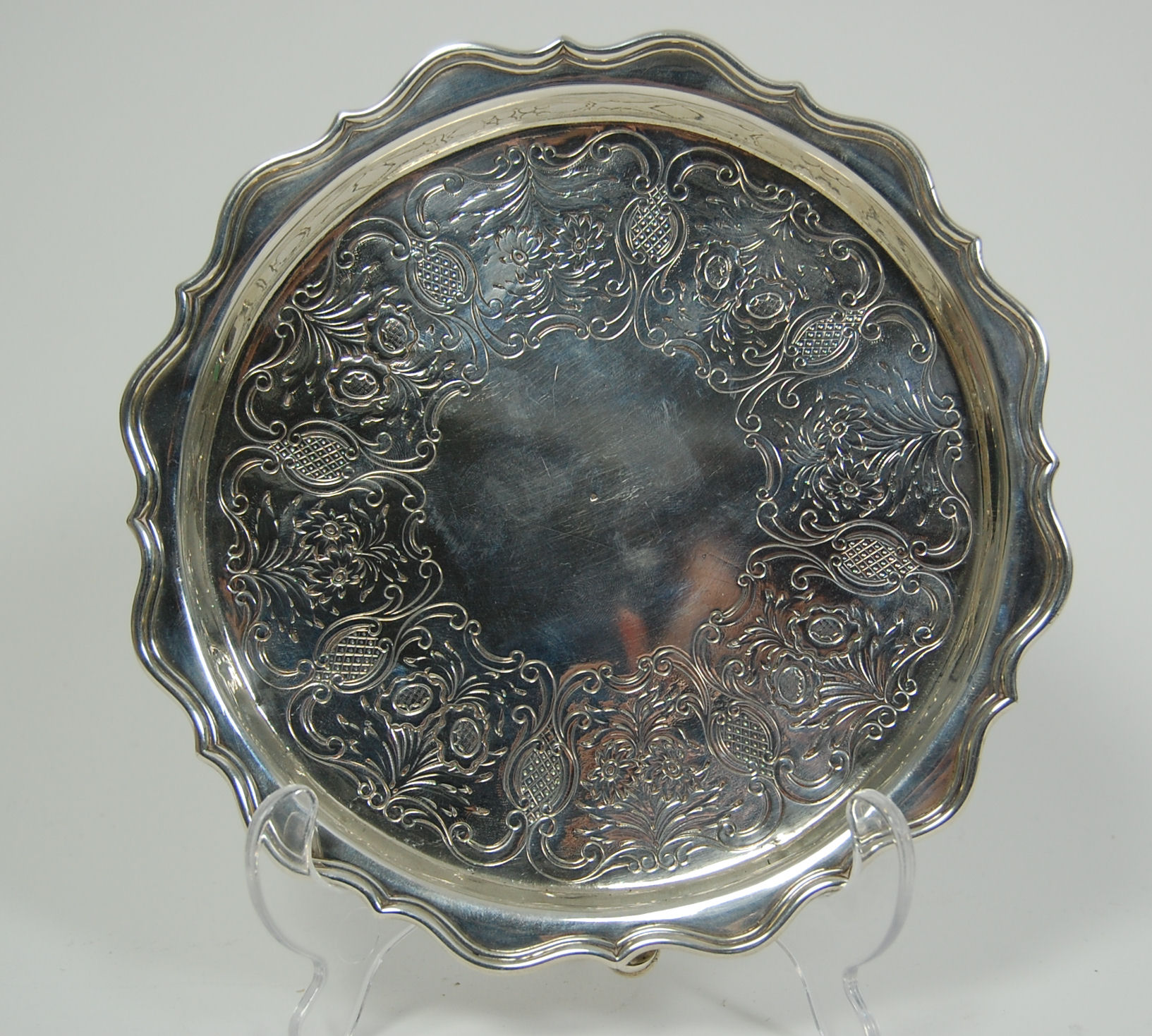 by Robert MacGregor of Elgin circa 1820, marked thistle, R.Mc.G, tree and baubles, baubles?, of shaped circular outline with raised moulded border, the well flat chased with scroll formed panels with foliate and flower head design, all raised on four double scroll and hoof feet, with original scratch weight to base