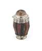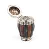 unmarked, the body formed of twelve varied coloured panels of hardstone and agates, the shaped mounts with foliate engraving, the hinged cover set with cabochon rock crystal and opening to reveal a hinged pierced and engraved grille and with owners initials 'JMT' to rim