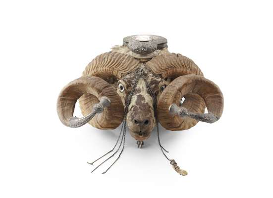 Johnathon Millidge, Edinburgh 1853 - 1854, the full head with well coiled horns with thistle mounts set with foil backed pastes, the top of the head with a circular snuff box, thistle decorated border and inset foil backed paste, a cheroot box and cover to the rear of oval form, engraved with armorial, the horn with five tools suspended from circular link chains, the whole on castors