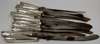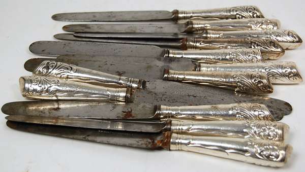 to include eleven table knives (ten with) with cutler's mark for CARGILL, handles with indistinct makers mark, the flared handles with embossed scroll decorations and engraved crest and motto; together with a set of twelve side knives of the same pattern with replaced blades marked HAMILTON & INCHES, handles unmarked, with matching engraved crest