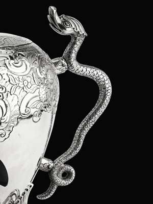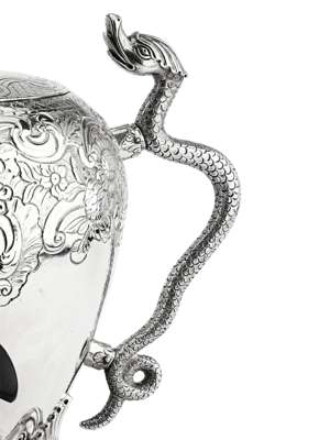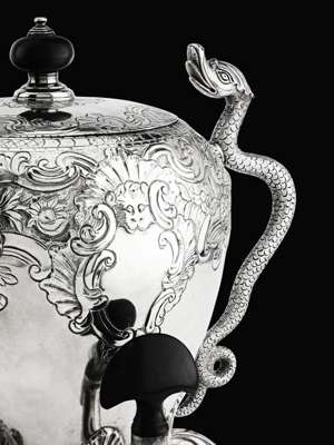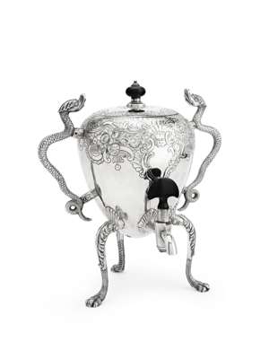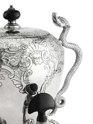 maker unknown, Edinburgh circa 1744 - 1759, of slightly compressed ovoid form with large chased border to upper body and rim with flower head and foliate scroll designs, containing twin blank scroll formed cartouches surmounted by lion mask detail, the slightly domed hinged cover with scroll border and diaper panels, with semi spiralled boss around ebony finial, the body set with twin scrolling serpent handles with detailed eyes and open mouths and with textured and chased bodies, the body set with straight spigot with ebony handle, the whole raised on three leaf capped cabriole legs with paw feet and shaped oval fluted appliques to body