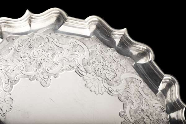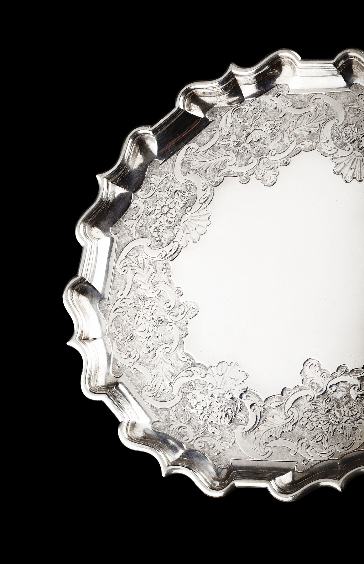 William Aytoun, Edinburgh 1740 - 1741, Assay Master Dougal Ged, of shaped circular outline with crescent and point border, the centre with wide chased band of decoration with scroll formed cartouches with floral and foliate displays within, the whole raised on four paw feet