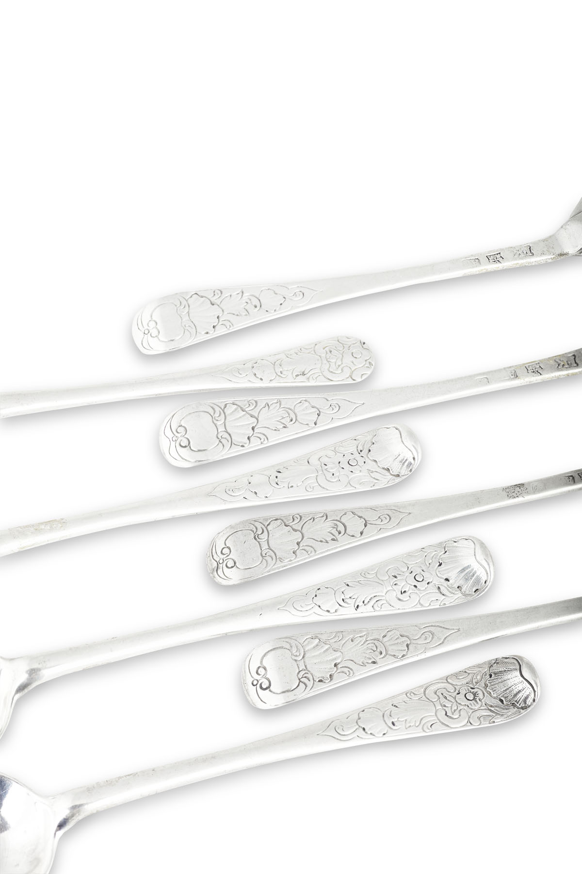 Notes: the chased decoration to these spoons appears to be a very unusual survival, while Hanoverian pattern is obviously standard for this period, the additional adornment is rarely seen. Also that they have the chased designs to both obverse and reverse shows the highly quality of this maker and indeed to the original commission.