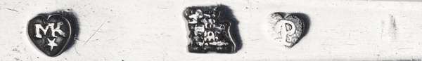 Although the date letter struck to this piece is very worn, there can be little doubt to the attribution. From the remaining outline of the punch it is obviously a shaped cartouche and not a straight sided punch, this combined with the clear Assay Masters mark of James Penman must place it to 1704 or earlier, as his tenure as Assay Master ends in 1707, and straight sided date letter punches are started in 1705.