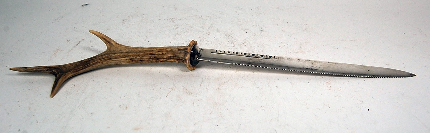by William Robb, marked Edinburgh 1921 - 1922, W.R, BLTR, the long blade with single fuller and serrated blade, with roe deer antler handle