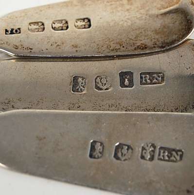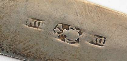 to include examples by John Ogilvie of Dundee marked JO, Pot of Lilies thrice; a pair of teaspoons by Robert Naughton of Dundee Marked Pot of Lilies thistle, Pot of Lilies, RN; a Feather edged teaspoon by William Scott of Dundee marked WS only; by William Constable of Dundee marked Pot of Lilies thrice, WC; by David Manson of Dundee marked DM, Pot of Lilies, DM; by William Leighton of Dundee marked WL, Pot of Lilies thrice; and by Alexander Cameron marked CAM/ERON, Edinburgh 1838, DUN/DEE (8)