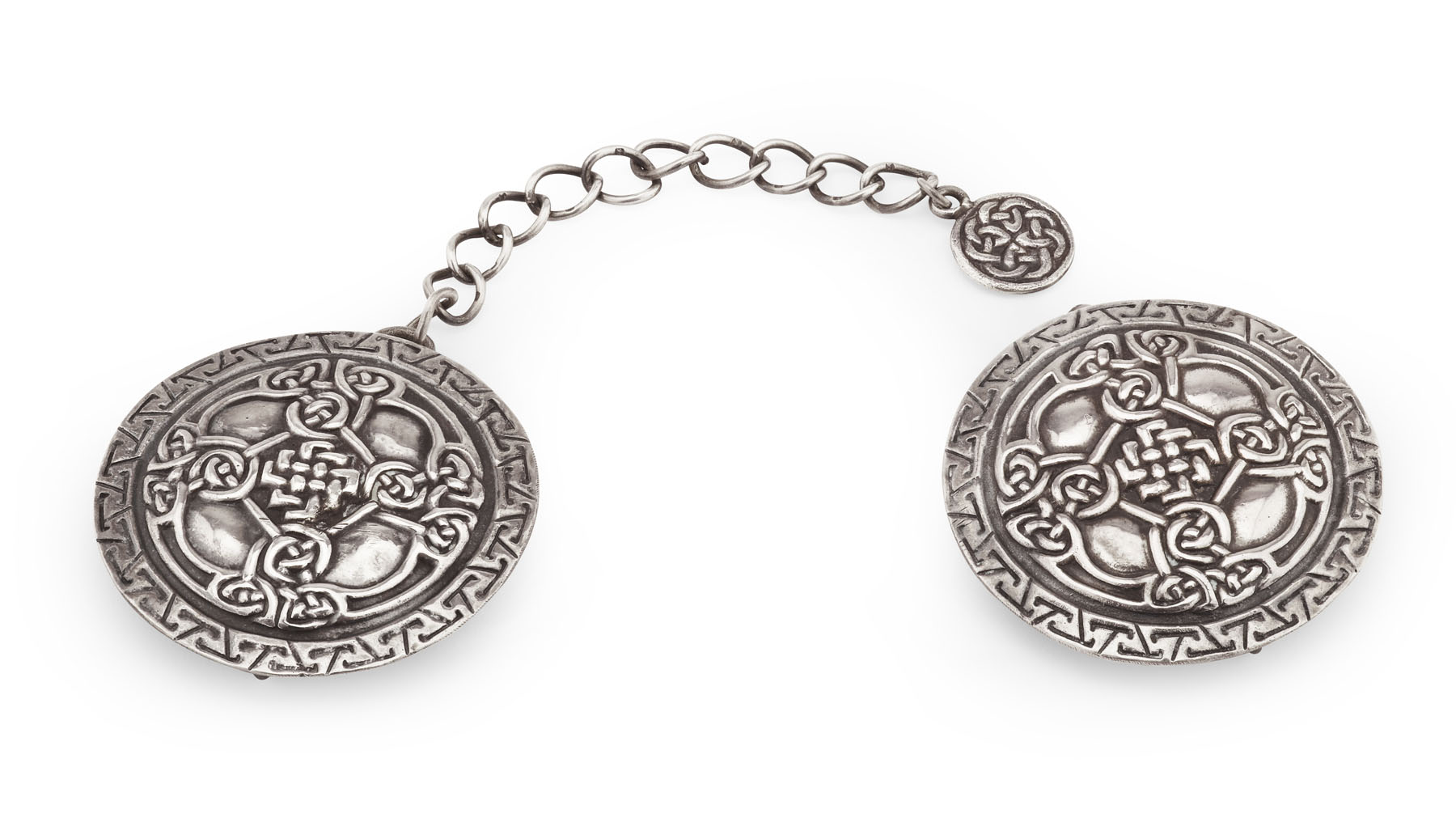 by Alexander Ritchie, Glasgow 1929, with additional IONA punches, each terminal or circular outline with knotwork and interlace panels and border, connected with oval belcher linked chain with circular Celtic knot work drop