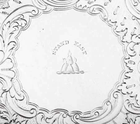 retailed by Charles Murray of Perth, Edinburgh 1827 - 1828, by Alexander Edmonstone, of circular outline with finely moulded border of flower heads, buds and foliate scrolls, the central flat chased with a wide border of similar designs with central scroll formed cartouche enclosing crest and motto, the whole raised on three large acanthus and scroll bracket feet