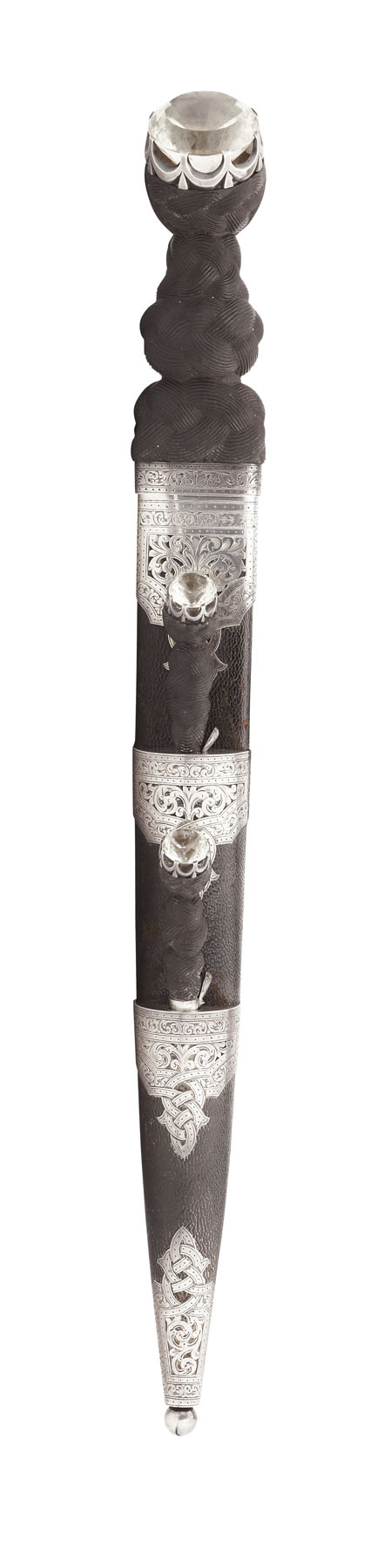 by R & H B Kirkwood, Edinburgh 1882, the black wood handle intricately carved with bands of interlace and claw set to pommel with round cut citrine, with double fullered plain steel blade, the leather covered wooden scabbard set en suite with bi knife and fork with carved wooden handles and claw set citrine pommels, the mounted pierced and engraved with foliate panels and prick dotted borders