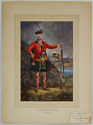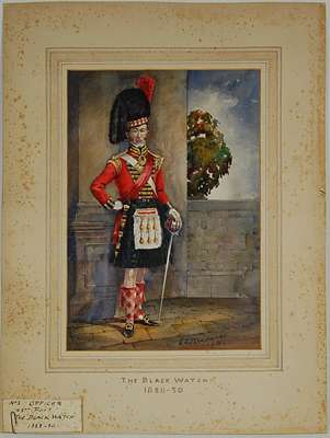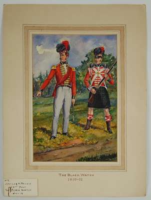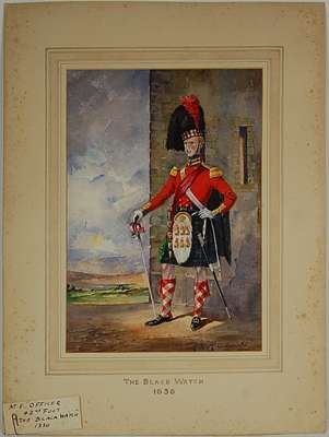 watercolour, signed and dated 1931, a collection of five watercolors, titled 'The Black Watch 1743', The Black Watch 1810 - 12', The Black Watch 1828 - 30', The Black Watch 1831', The Black Watch 1836', mounted and titled (5)