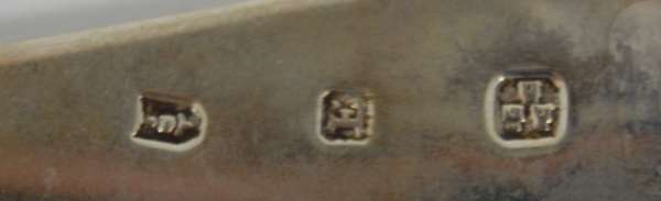 James Erskine, marked, hand and dagger, E, three castles, of Old English pattern with chased shell and foliage to handles, the gilt bowls embossed and chased with border of fruits around a central shield cartouche of foliate scrolls (2)