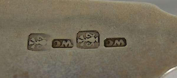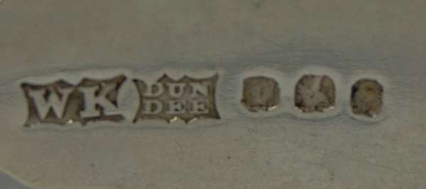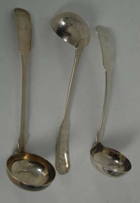 William Kermath, marked WK, DUN/DEE, three indistinct marks, of Fiddle pattern with engraved script B to terminal and numbered 1 to heel; a Dundee toddy ladle, W Constable, WC, pot of lilies, WC, pot of lilies; and a Dundee / Montrose toddy ladle, marked three bishops mitre or pot of lilies GB (3)