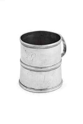 Charles Fowler, marked CF, ELn, D, of simple straight sided can form with reeded rim, foot and girdle, the upper section with engraved foliate initials 'IG', with S scroll strap handle