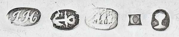 John Heron, marked JH (in script), anchor, ship, C, oak tree, of Celtic point pattern with engraved script initial CR to terminal and deep circular bowl