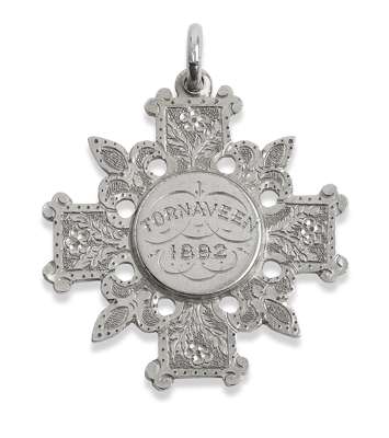 William Robb, marked W.R, KO'N, Edinburgh 1890, of cross form with fleur de lis in angles with engraved foliate details around a central disc inscribed 'TORNAVEEN 1892', reverse plain