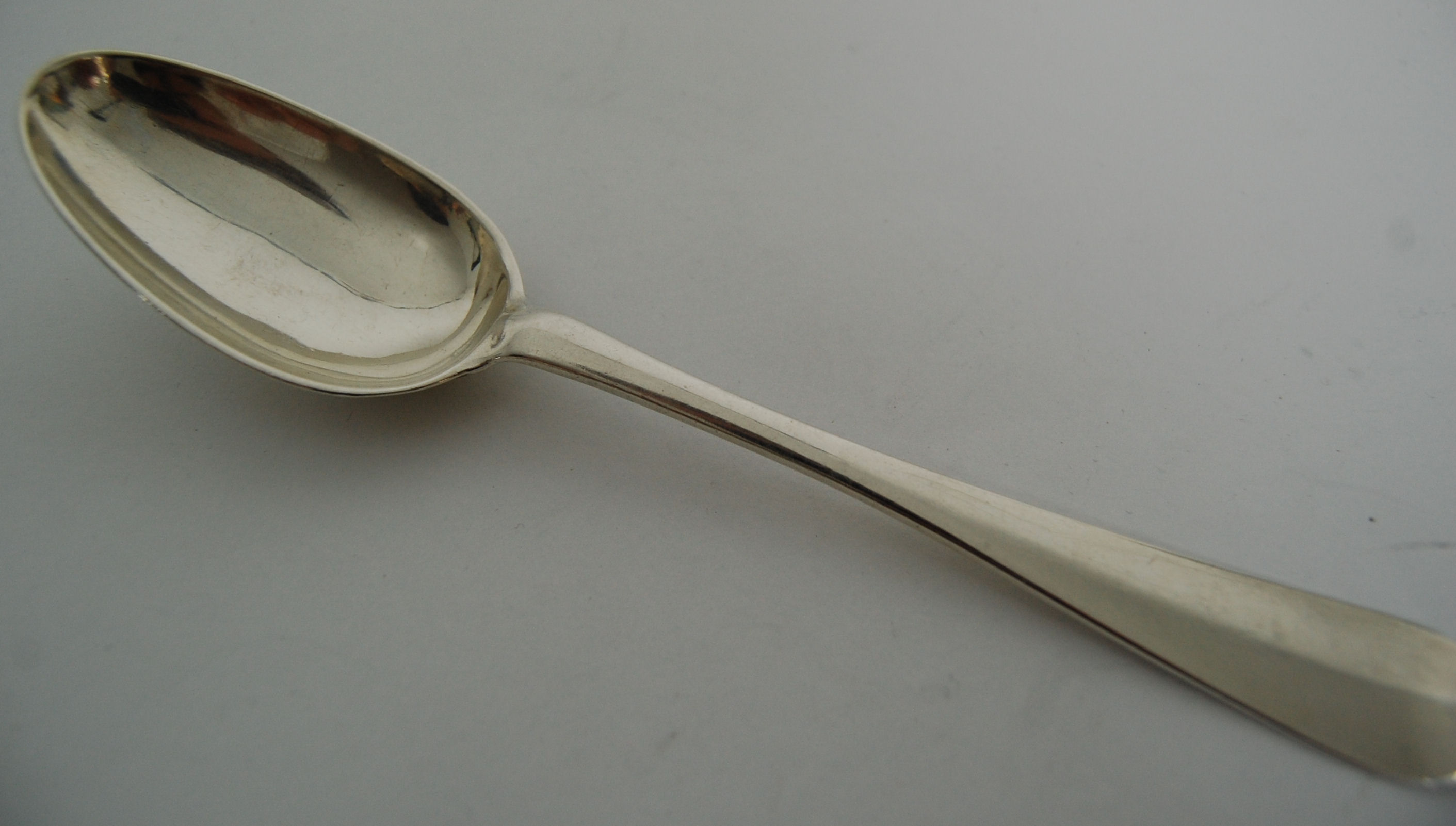 Benjamin Lumsden, bottom marked to stem BL twice, of ribbed Hanoverian pattern with engraved initial 'W:R / B:F', with large rounded heel to bowl